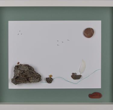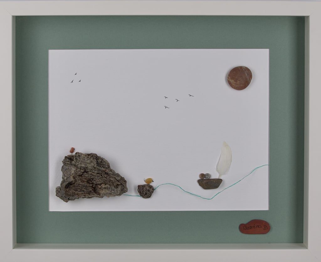 Obra que celebra a simplicidade dos elementos naturais, com pedras pequenas, conchas e penas cuidadosamente posicionadas para transmitir harmonia.