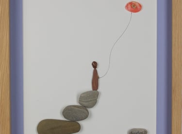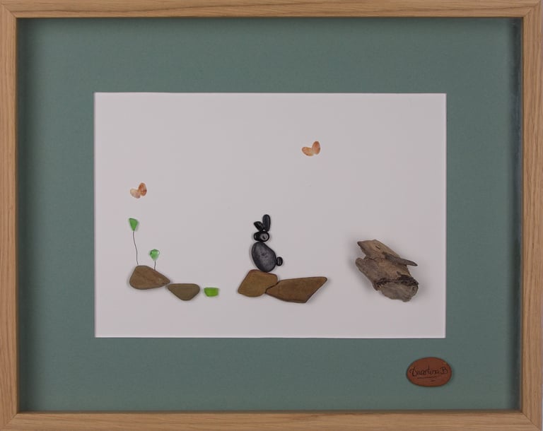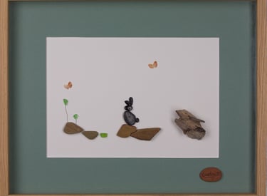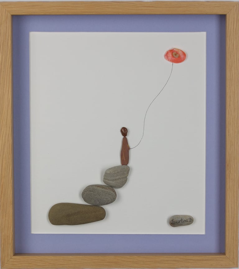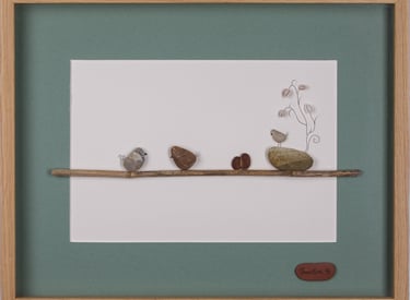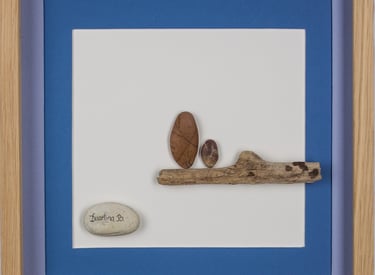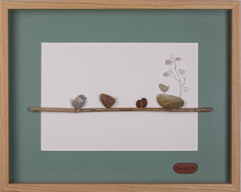 Cada quadro é uma composição artesanal com pedras, conchas, gravetos e penas.